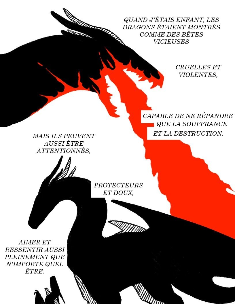 Sur fond blanc Première moitié: la silhouette noire de la tête et du cou d'un dragon qui crache un feu rouge, tourné vers la droite. Il a deux paires de cornes, une noire et une blanche, sur sa tête. Sa bouche et une partie de son cou sont éclaboussés de rouge. Le texte en majuscules noires dit: "Quand j'étais enfant, les dragons étaient montrés comme des bêtes vicieuses cruelles et violentes, capable de ne répandre que la souffrance et la destruction." Deuxième moitié: La silhouette du dragon est montrée en entier. Il est tourné vers la gauche, au dessus d'un bébé dragon qui lève le haut de son corps et sa tête vers lui. Le texte dit: "Mais ils peuvent aussi être attentionnés, protecteurs et doux, aimer et ressentir aussi pleinement que n'importe quel être."