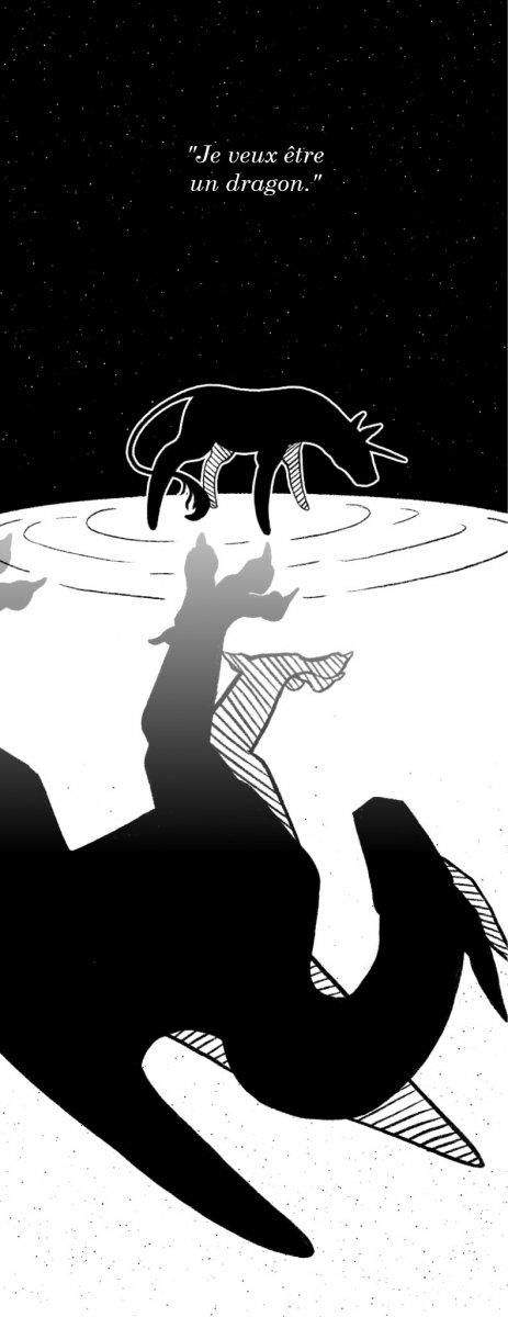 La licorne noire se tient sous un ciel noir et étoilé et contemple son reflet dans l'eau. Un dragon, noir dans l'eau blanche, s'y reflète. Au dessus de la licorne, entre guillemets et en lettres cursives, il est écrit: "Je veux être un dragon."
